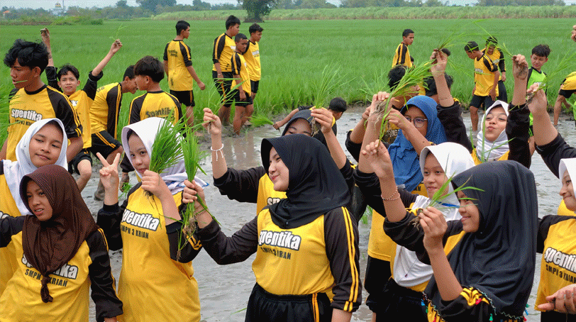Pada kegiatan menanam padi, peserta didik diajak turun langsung ke sawah untuk belajar proses awal bercocok tanam. Dengan didampingi fasilitator, mereka dikenalkan pada cara menanam bibit padi dengan jarak dan posisi yang benar. Meskipun harus melewati lumpur yang lengket dan licin, para siswa tetap antusias dan saling membantu. Dari kegiatan ini, mereka belajar tentang kerja keras petani, pentingnya ketekunan, serta rasa syukur atas makanan pokok yang setiap hari dikonsumsi.